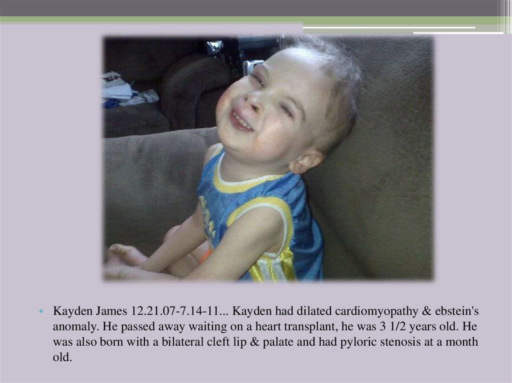 • Kayden James 12.21.07-7.14-11... Kayden had dilated cardiomyopathy & ebstein'sanomaly. He passed away waiting on a heart transplant, he was 3 1/2 years old. He