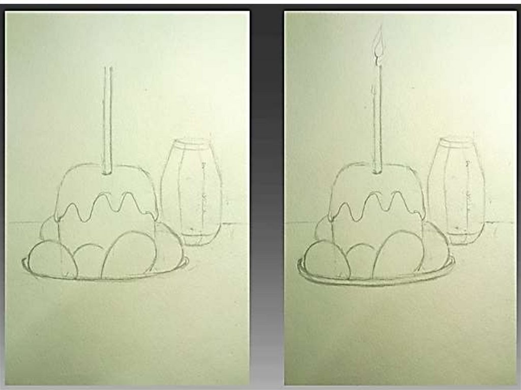 • Прорисуем ветви вербы и свечу на куличе.