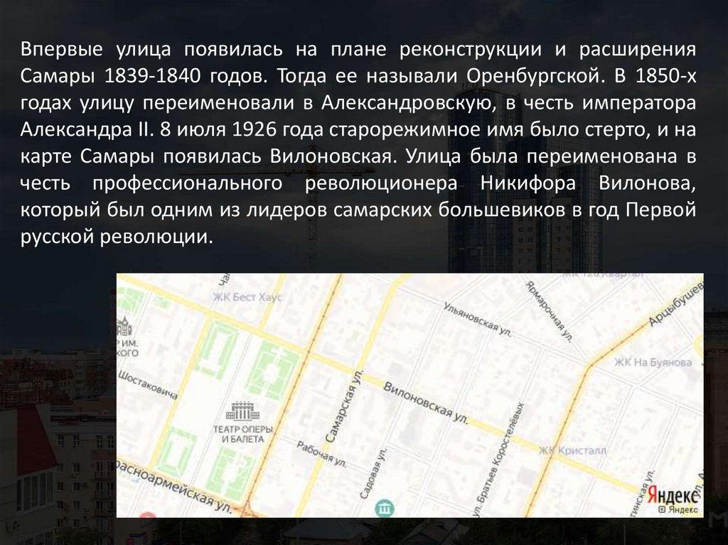 Впервые улица появилась на плане реконструкции и расширенияСамары 1839-1840 годов. Тогда ее называли Оренбургской. В 1850-х