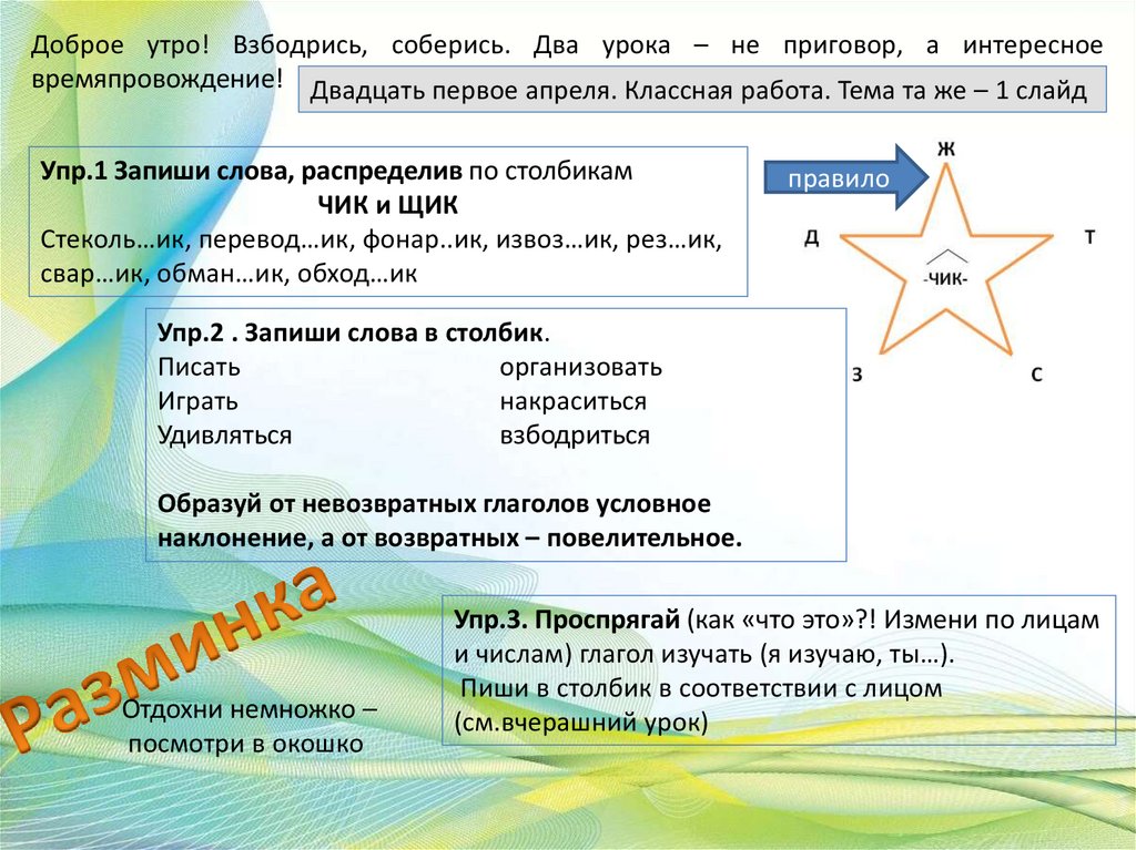 Доброе утро! Взбодрись, соберись. Два урока – не приговор, а интересноевремяпровождение! Двадцать первое апреля. Классная работа. Тема та же – 1 слайд