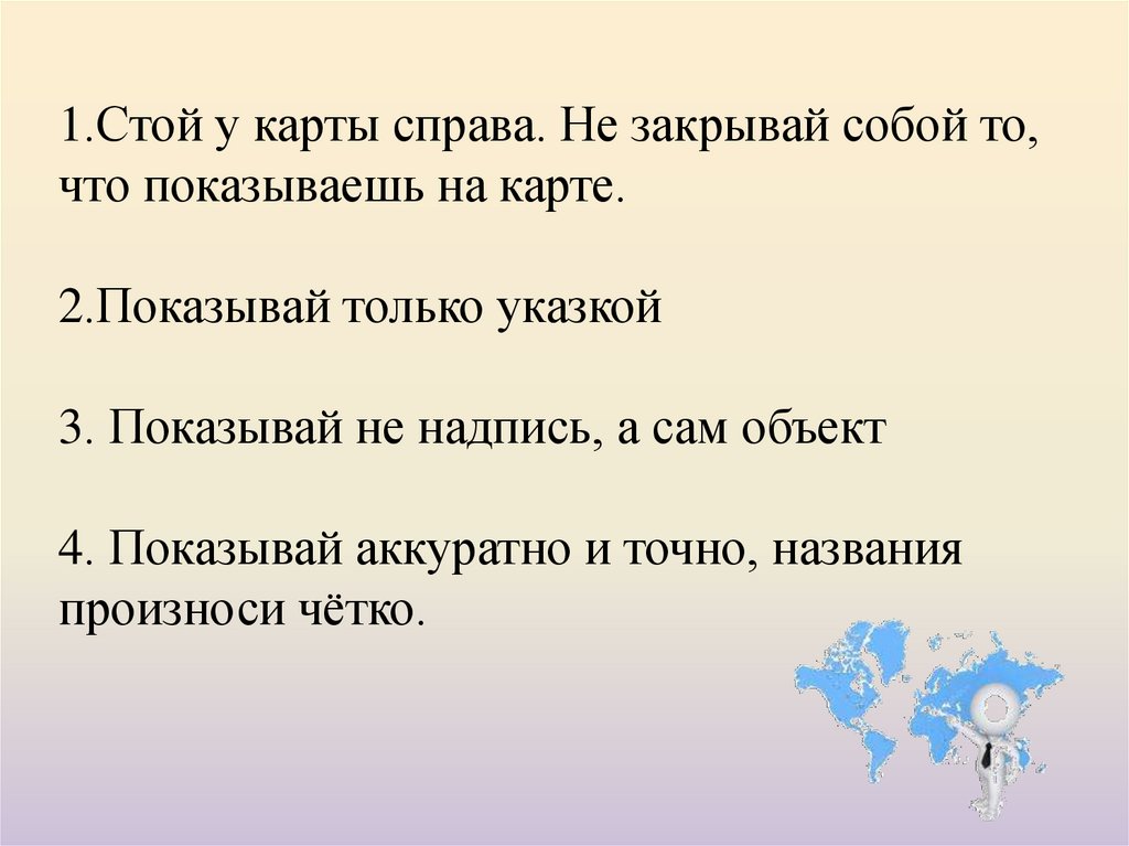 1.Стой у карты справа. Не закрывай собой то,что показываешь на карте.