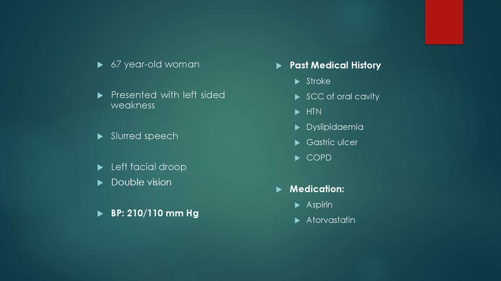 67 year-old womanPresented with left sided