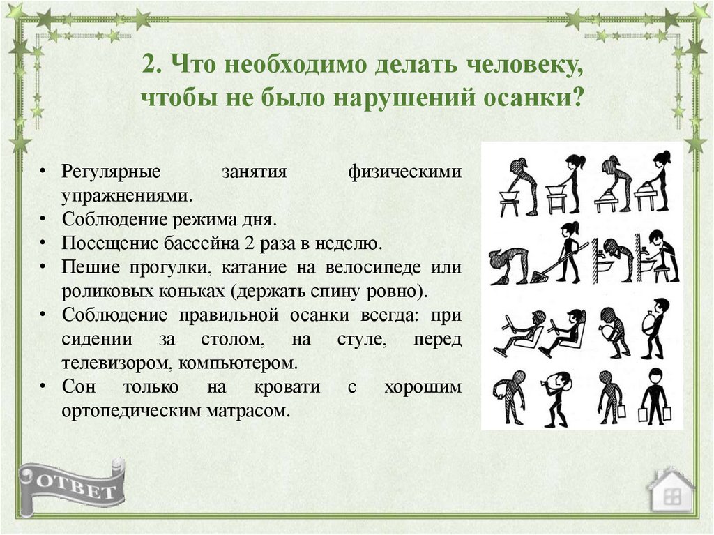 2. Что необходимо делать человеку,чтобы не было нарушений осанки?