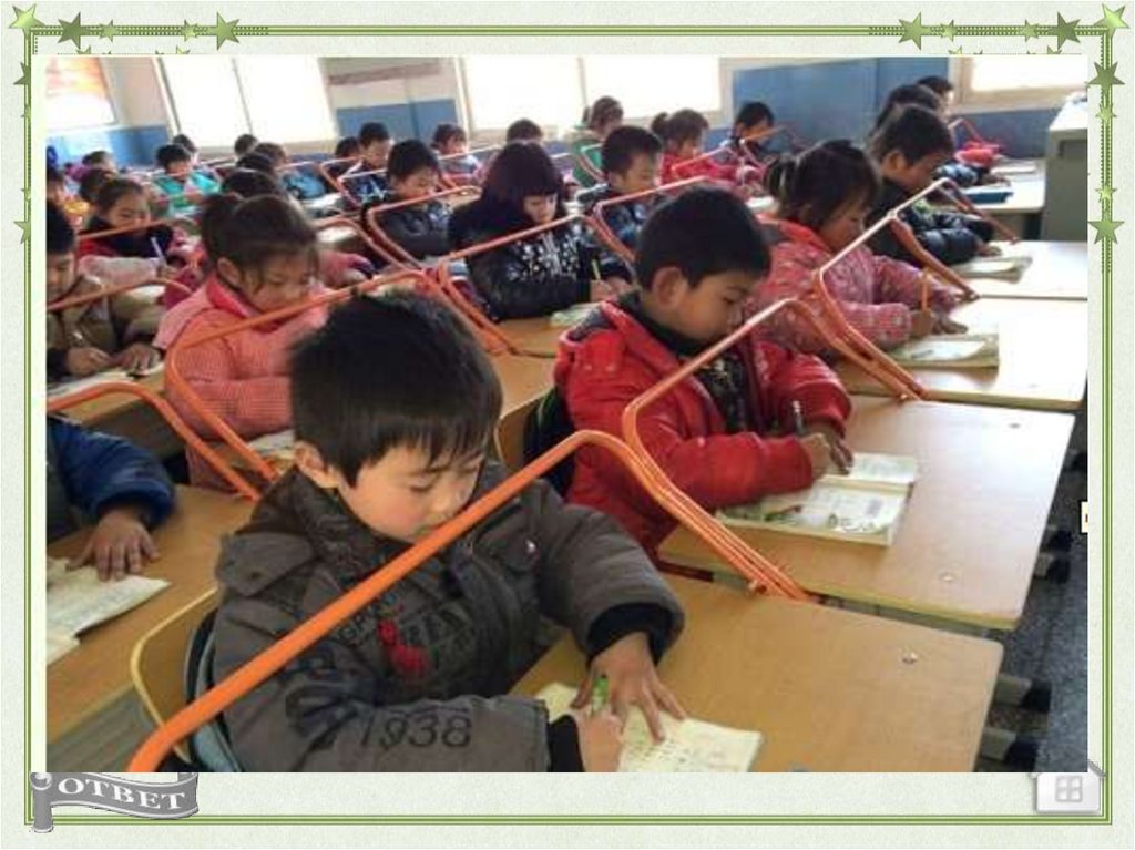 за партой или столом сидите прямо, слегка