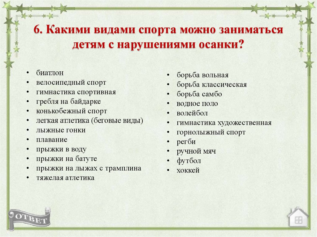 6. Какими видами спорта можно заниматьсядетям с нарушениями осанки?