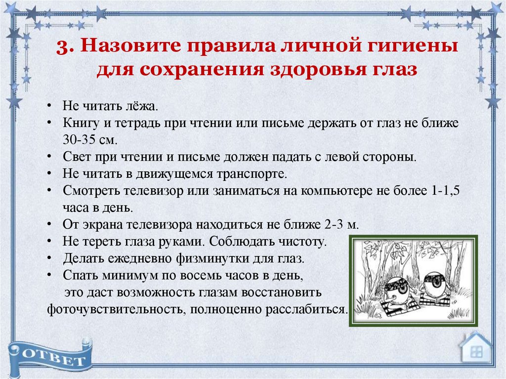 3. Назовите правила личной гигиеныдля сохранения здоровья глаз