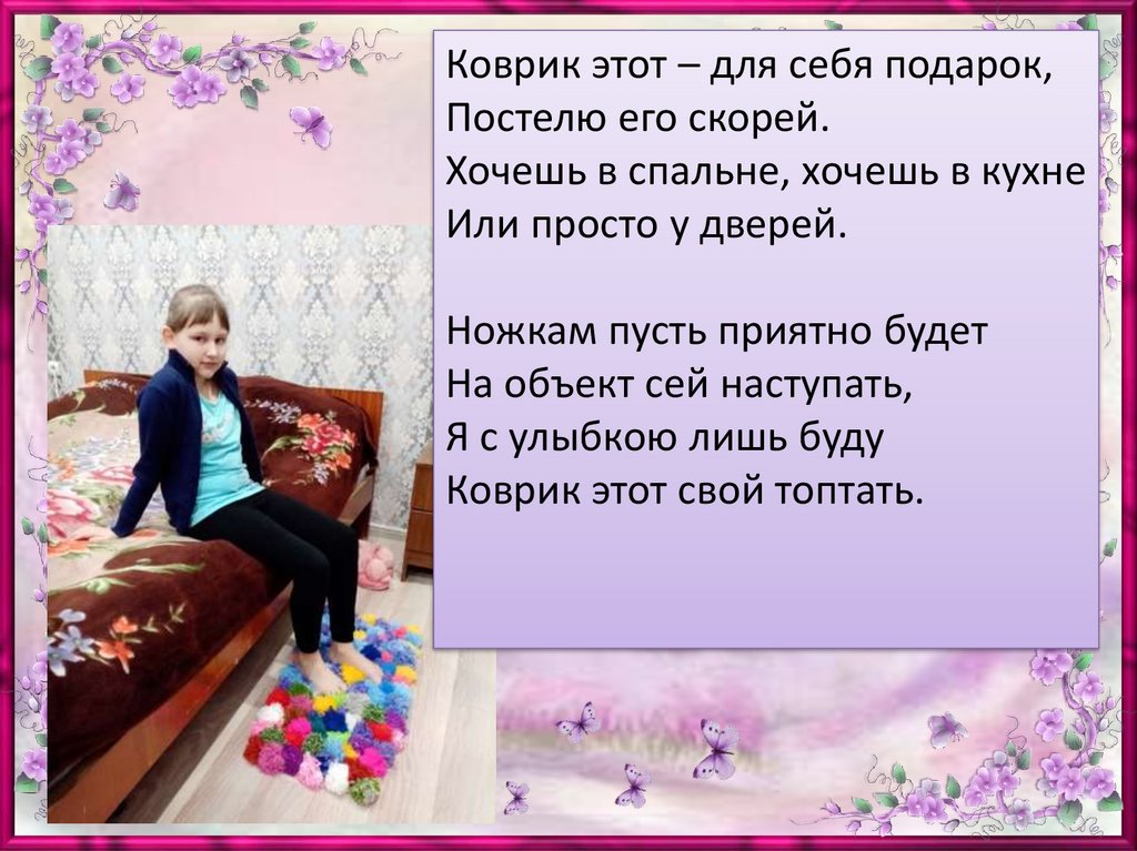 Коврик этот – для себя подарок,Постелю его скорей.