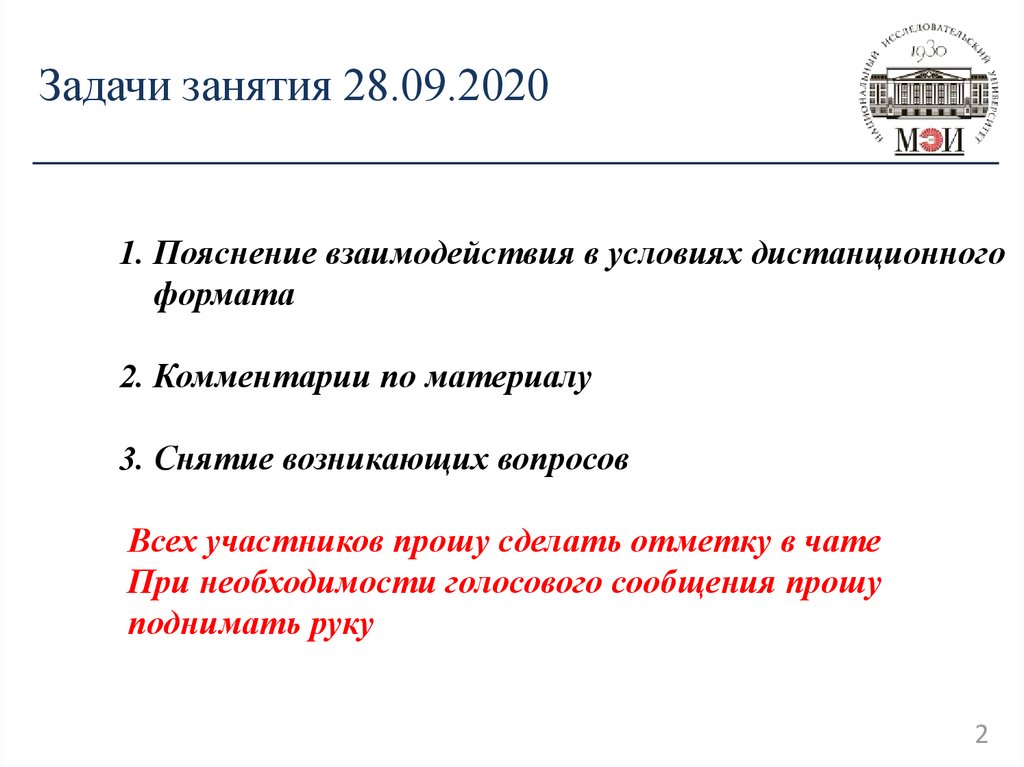 Задачи занятия 28.09.20201. Пояснение взаимодействия в условиях дистанционного