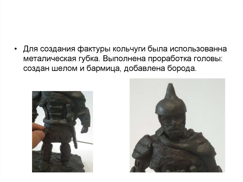 • Для создания фактуры кольчуги была использованнаметалическая губка. Выполнена проработка головы:
