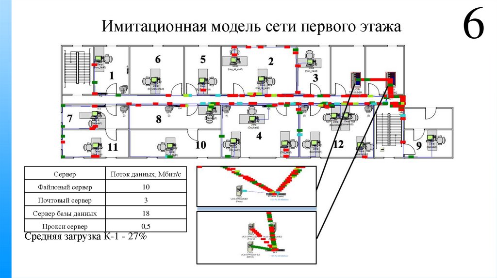 Имитационная модель сети третьего этажаСредняя загрузка К-12 - 22%