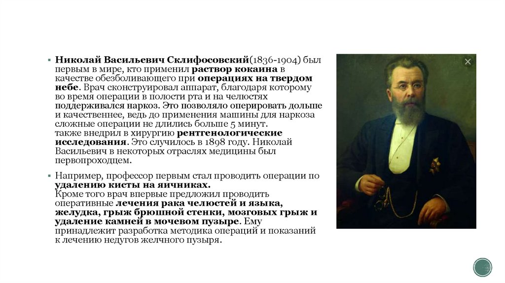 Николай Васильевич Склифосовский(1836-1904) былпервым в мире, кто применил раствор кокаина в