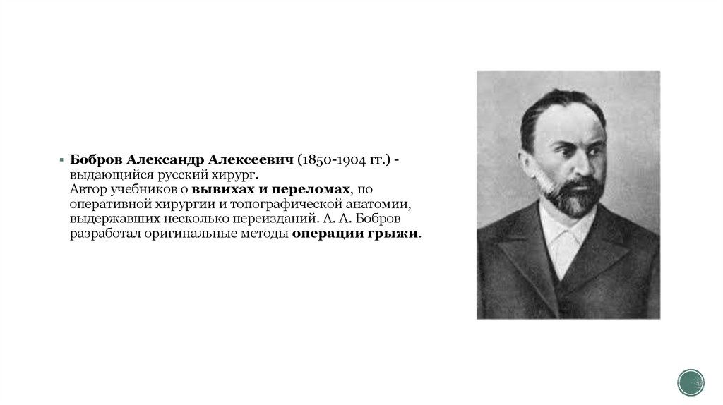 Бобров Александр Алексеевич (1850-1904 гг.) -выдающийся русский хирург.