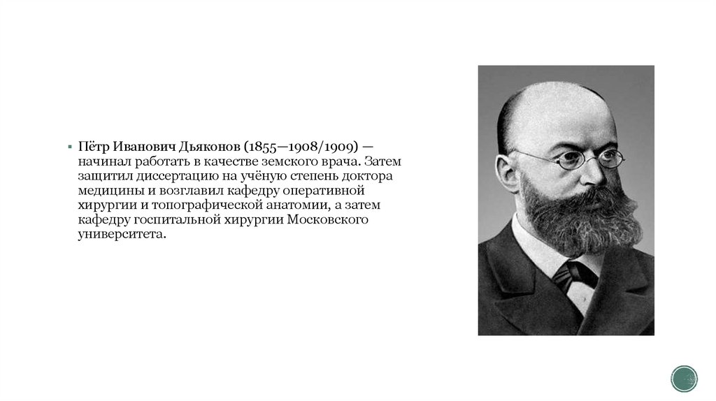 Пётр Иванович Дьяконов (1855—1908/1909) —начинал работать в качестве земского врача. Затем