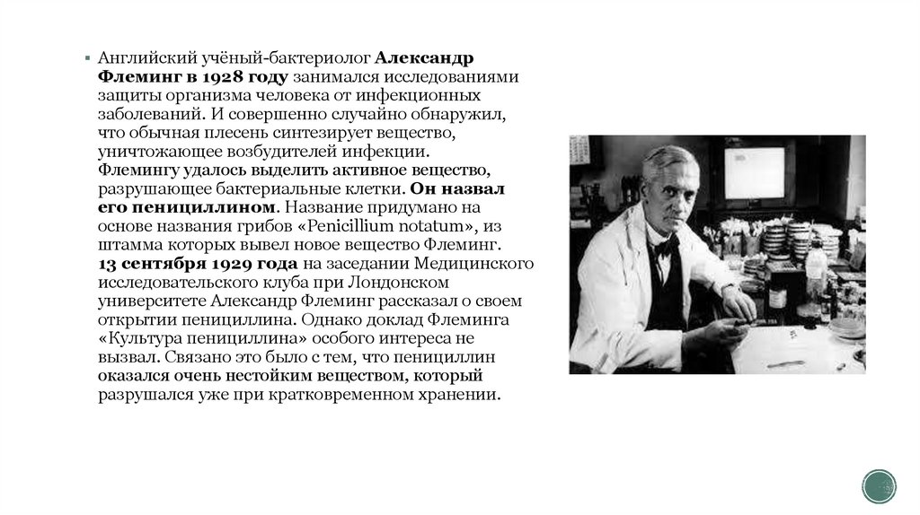 Английский учёный-бактериолог АлександрФлеминг в 1928 году занимался исследованиями