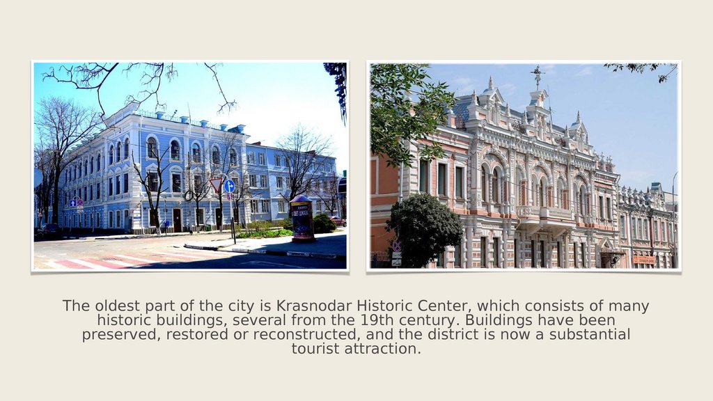 The oldest part of the city is Krasnodar Historic Center, which consists of manyhistoric buildings, several from the 19th century. Buildings have been