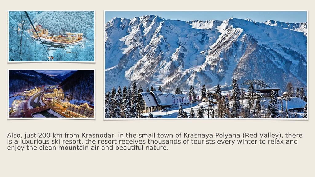 Also, just 200 km from Krasnodar, in the small town of Krasnaya Polyana (Red Valley), thereis a luxurious ski resort, the resort receives thousands of tourists every winter to relax and