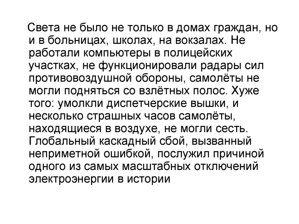 Света не было не только в домах граждан, нои в больницах, школах, на вокзалах. Не