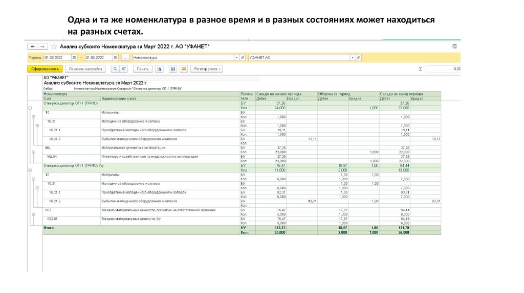 Одна и та же номенклатура в разное время и в разных состояниях может находитьсяна разных счетах.