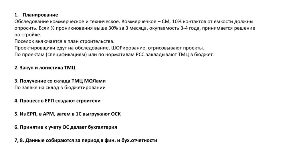 1. ПланированиеОбследование коммерческое и техническое. Коммерчечкое – СМ, 10% контактов от емкости должны