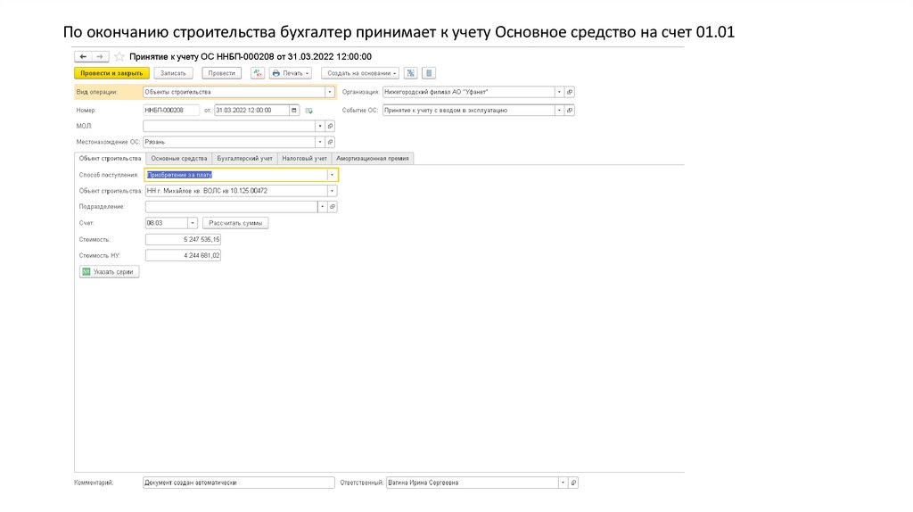 По окончанию строительства бухгалтер принимает к учету Основное средство на счет 01.0110.