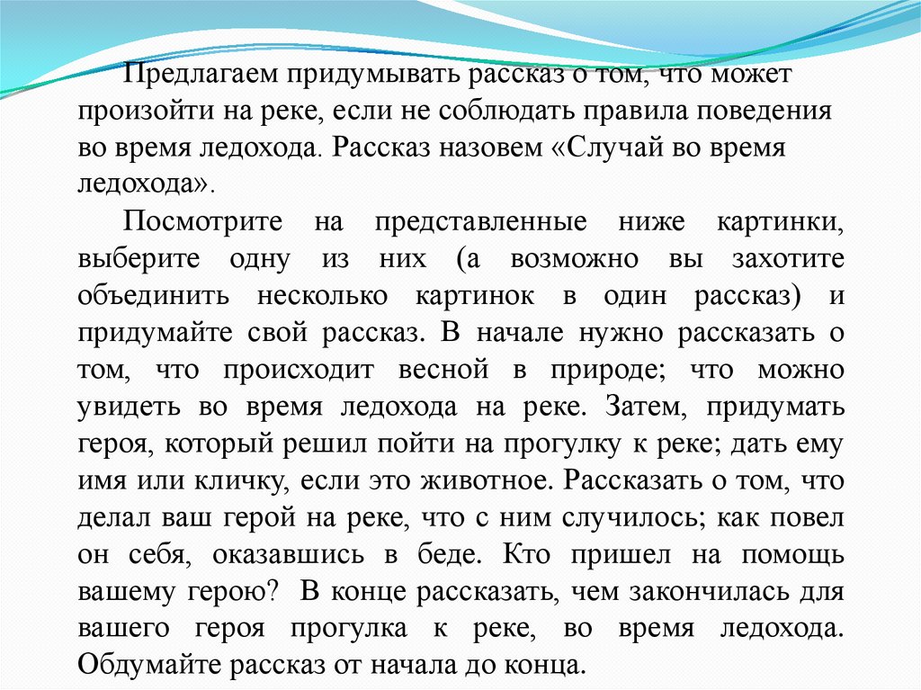 Предлагаем придумывать рассказ о том, что можетпроизойти на реке, если не соблюдать правила поведения