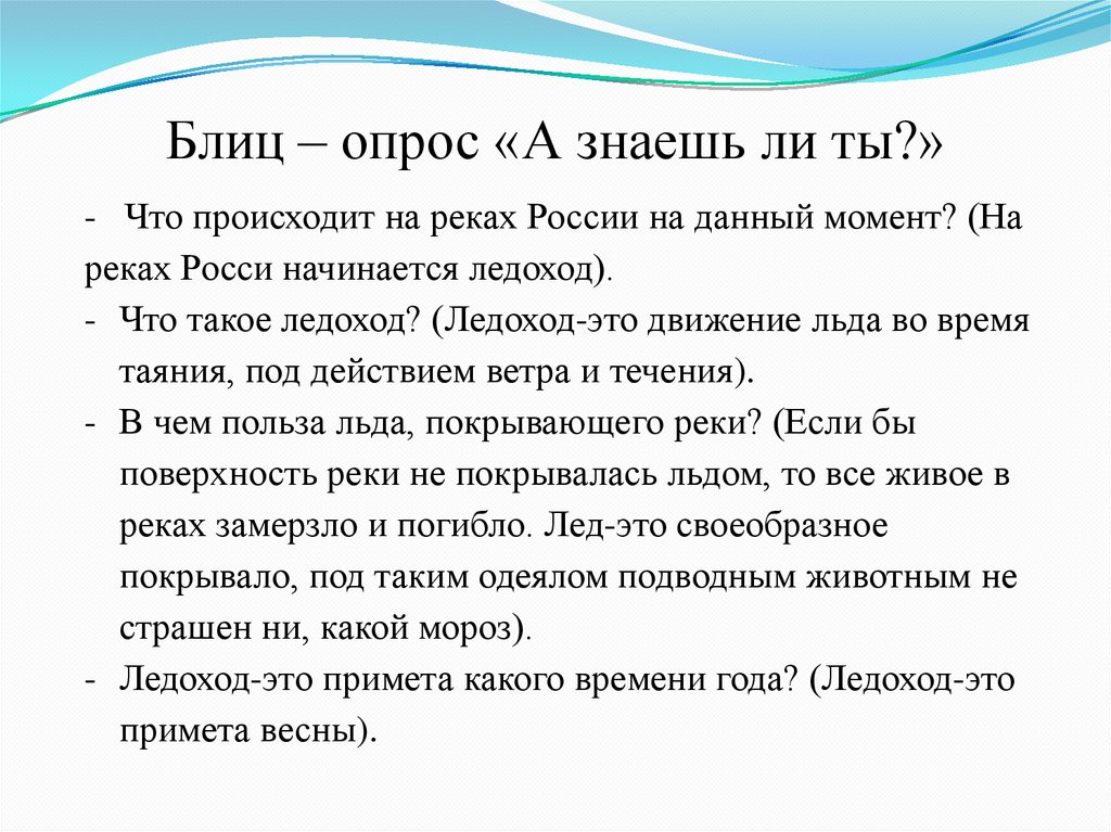 Блиц – опрос «А знаешь ли ты?»- Что происходит на реках России на данный момент? (На