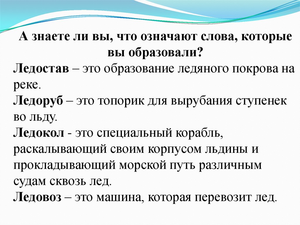 колит – ледокол, лед рубит – ледоруб, лед ставитледостав, лед возит – ледовоз, лед ломает –