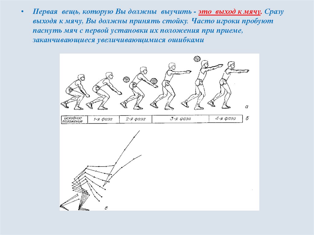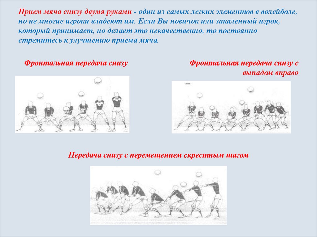 Прием мяча снизу двумя руками - это решающий элемент при переходе отзащиты к нападению и возвращению подачи. Насколько хороший прием часто диктует, как будет идти остальная часть игры. Команда, которая