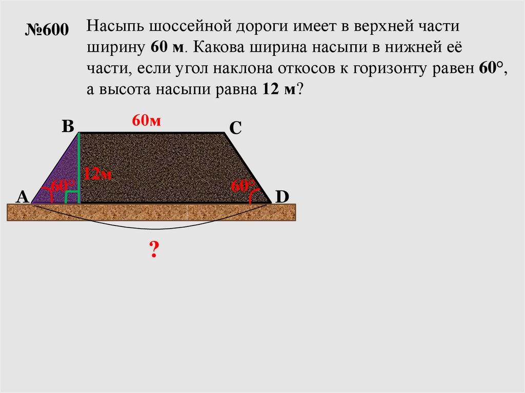 Насыпь шоссейной дороги имеет в верхней частиширину 60 м. Какова ширина насыпи в нижней её