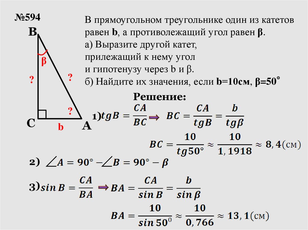и гипотенузу через b и β.