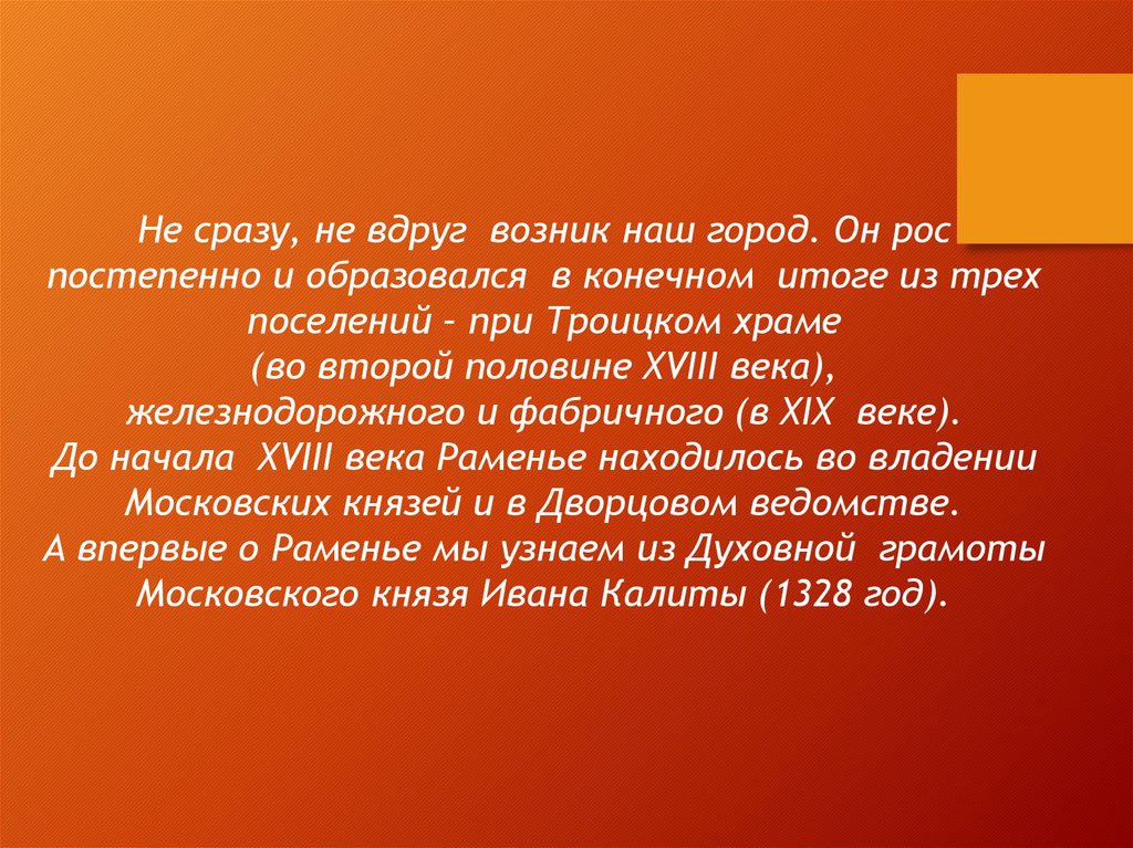 Не сразу, не вдруг возник наш город. Он роспостепенно и образовался в конечном итоге из трех