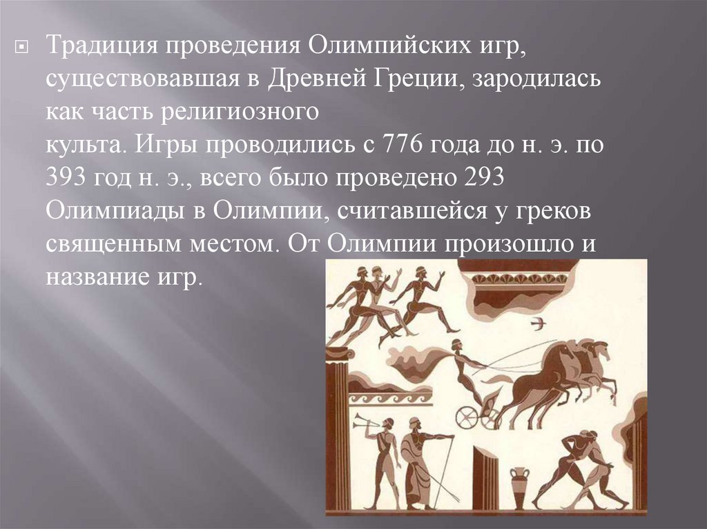 Традиция проведения Олимпийских игр,существовавшая в Древней Греции, зародилась
