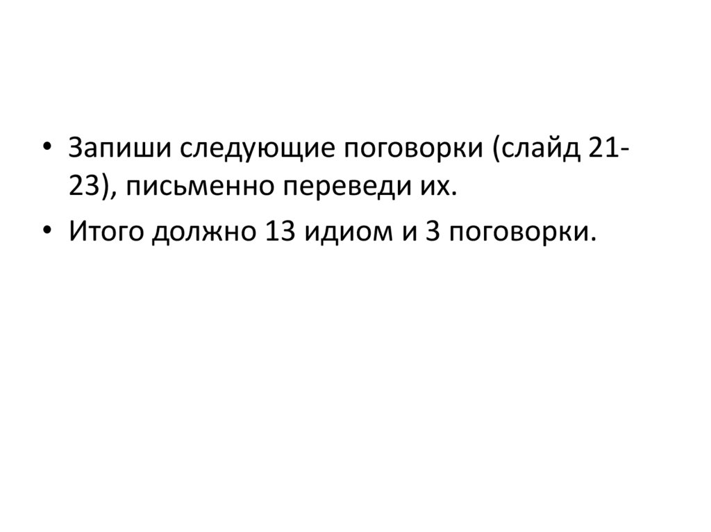 • Запиши следующие поговорки (слайд 2123), письменно переведи их.• Итого должно 13 идиом и 3 поговорки.