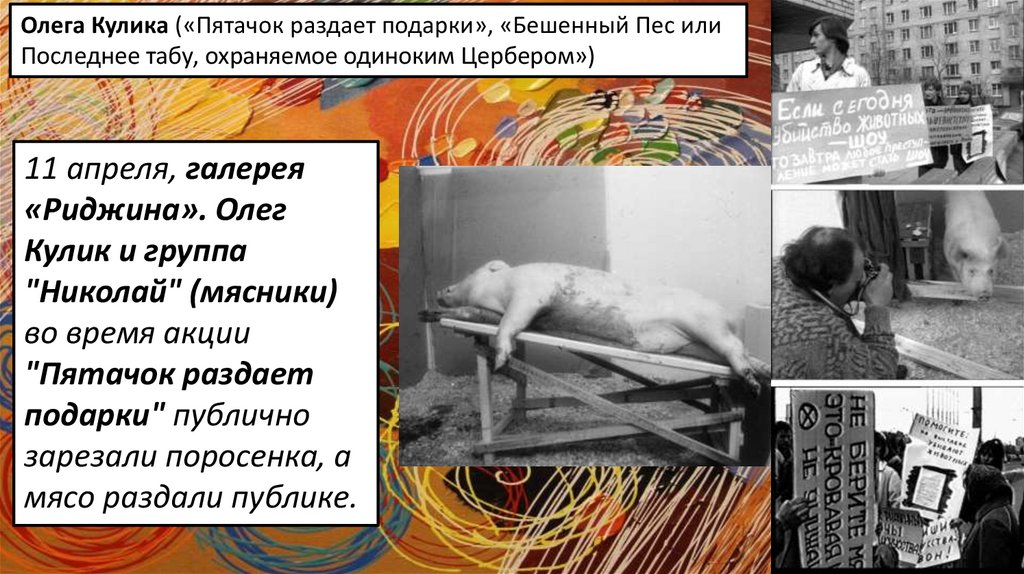 Олега Кулика («Пятачок раздает подарки», «Бешенный Пес илиПоследнее табу, охраняемое одиноким Цербером»)