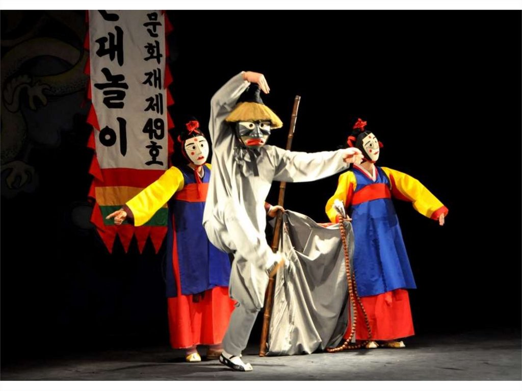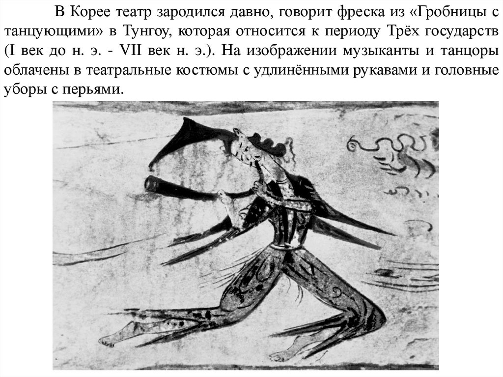 В Корее театр зародился давно, говорит фреска из «Гробницы станцующими» в Тунгоу, которая относится к периоду Трёх государств