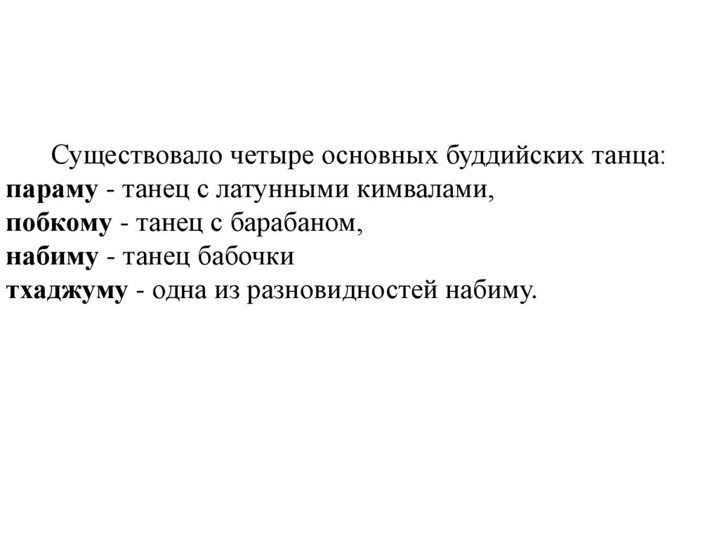 Существовало четыре основных буддийских танца:параму - танец с латунными кимвалами,