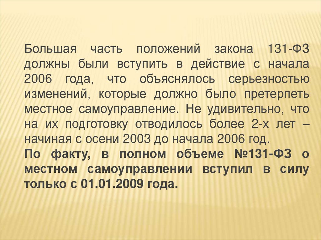 Большая часть положений закона 131-ФЗдолжны были вступить в действие с начала