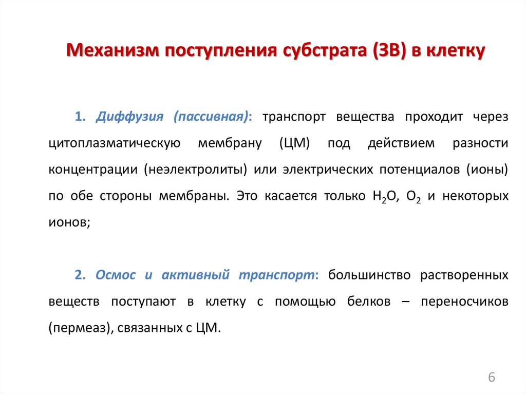 Механизм поступления субстрата (ЗВ) в клетку1. Диффузия (пассивная): транспорт вещества проходит через