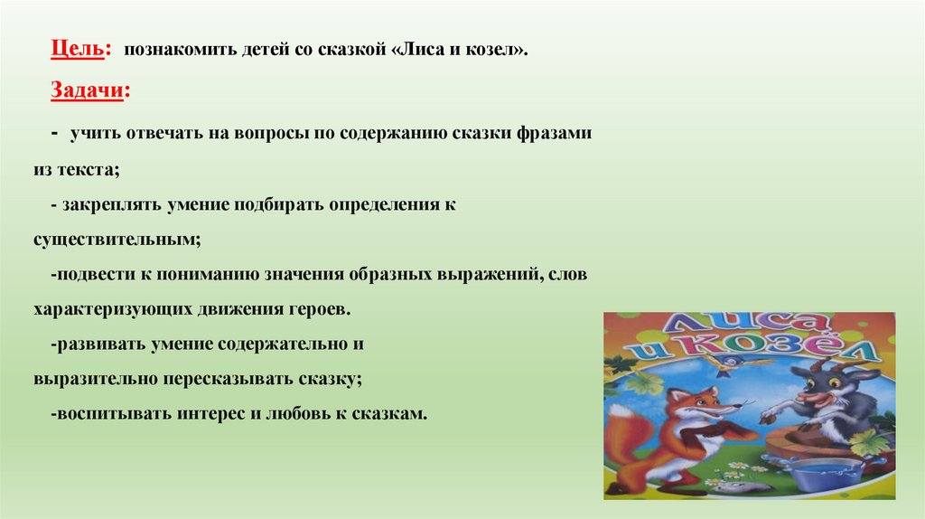 Цель: познакомить детей со сказкой «Лиса и козел».Задачи: