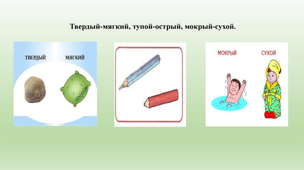 Твердый-мягкий, тупой-острый, мокрый-сухой.14.