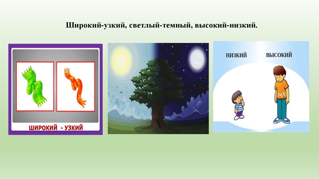 Широкий-узкий, светлый-темный, высокий-низкий.15.