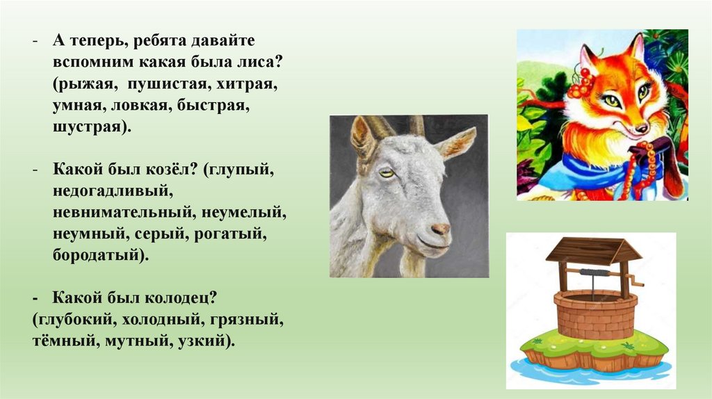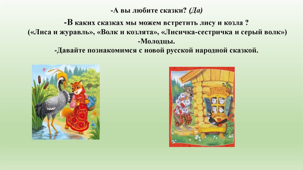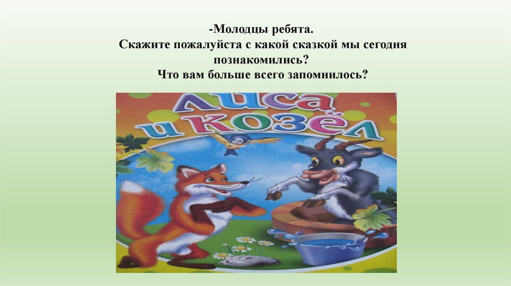 -А вы любите сказки? (Да)-В каких сказках мы можем встретить лису и козла ?