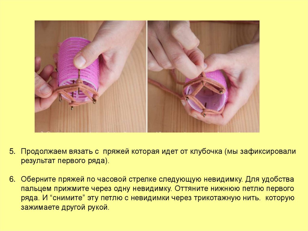 7. Опять оберните трикотажной пряжи от клубкапо часовой стрелкеследующую невидимку. Прижмите пальцем через одну.