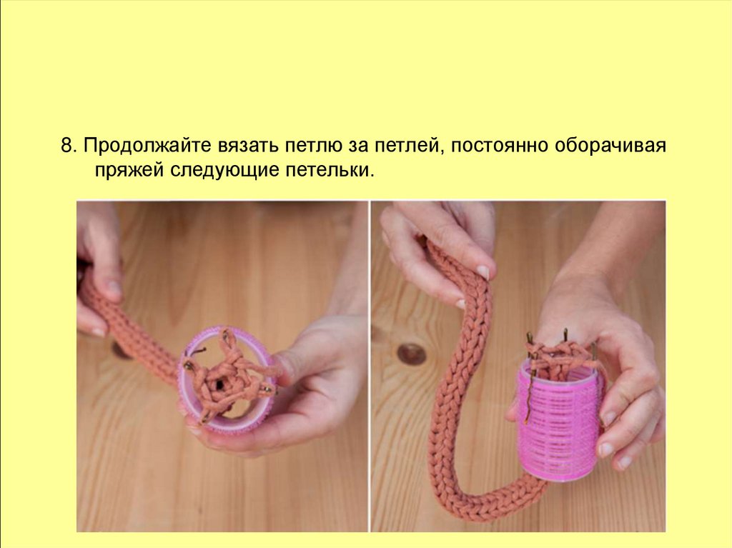 8. Продолжайте вязать петлю за петлей, постоянно оборачиваяпряжей следующие петельки.