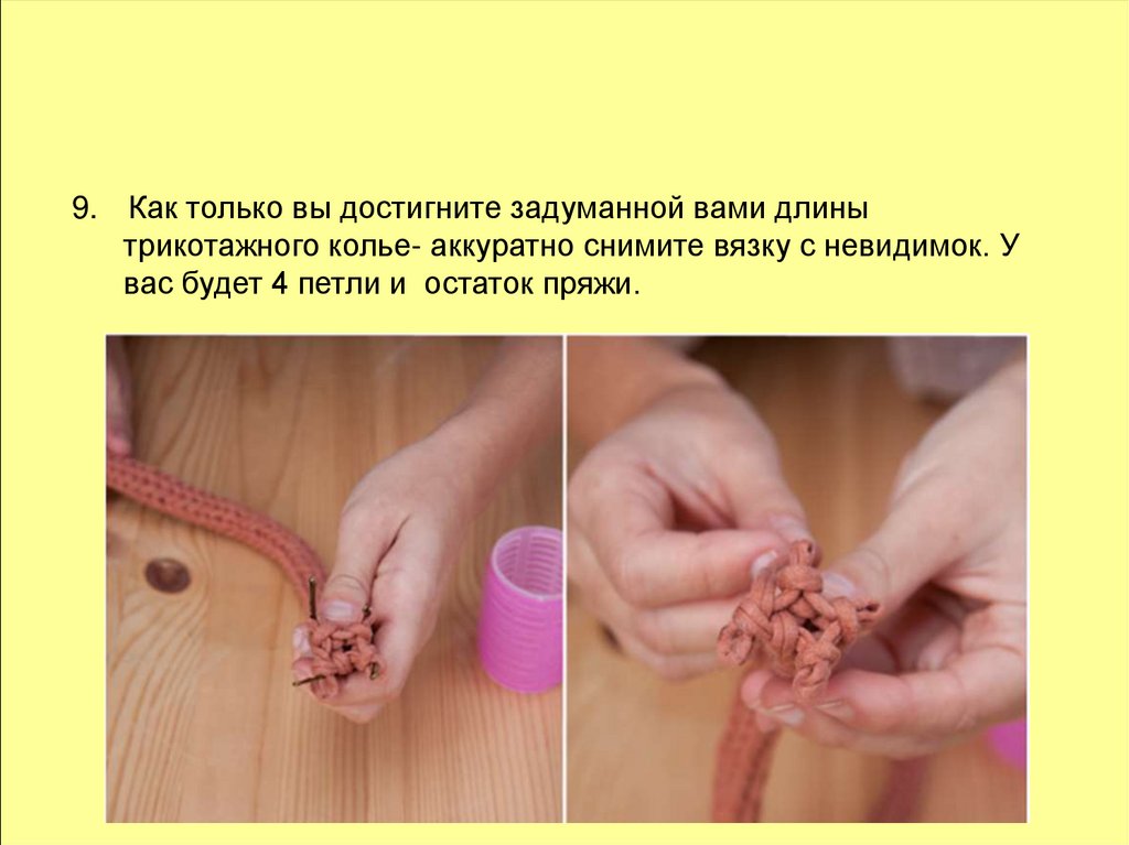 9. Как только вы достигните задуманной вами длинытрикотажного колье- аккуратно снимите вязку с невидимок. У