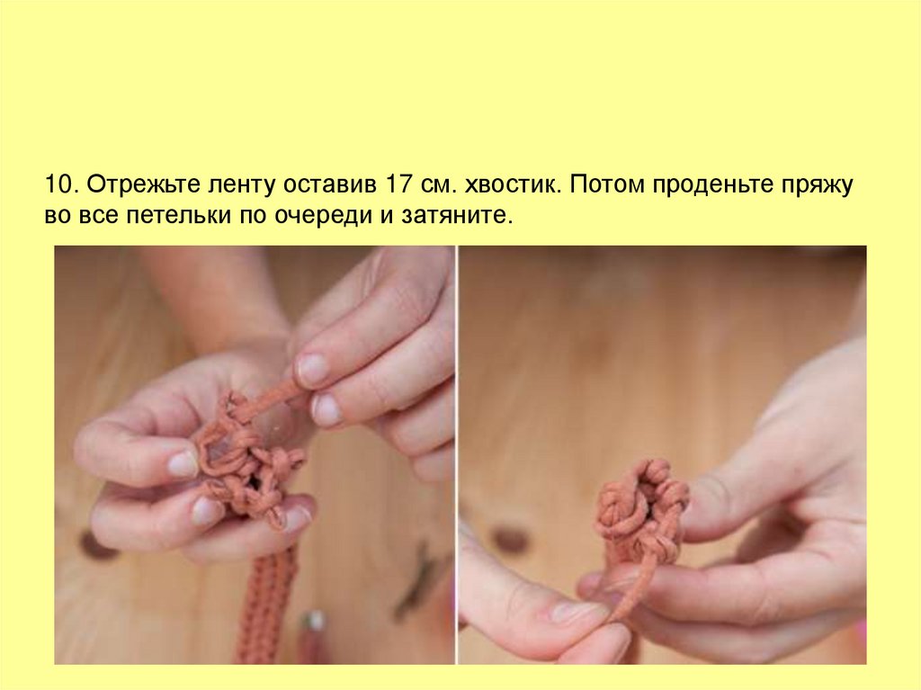10. Отрежьте ленту оставив 17 см. хвостик. Потом проденьте пряжуво все петельки по очереди и затяните.