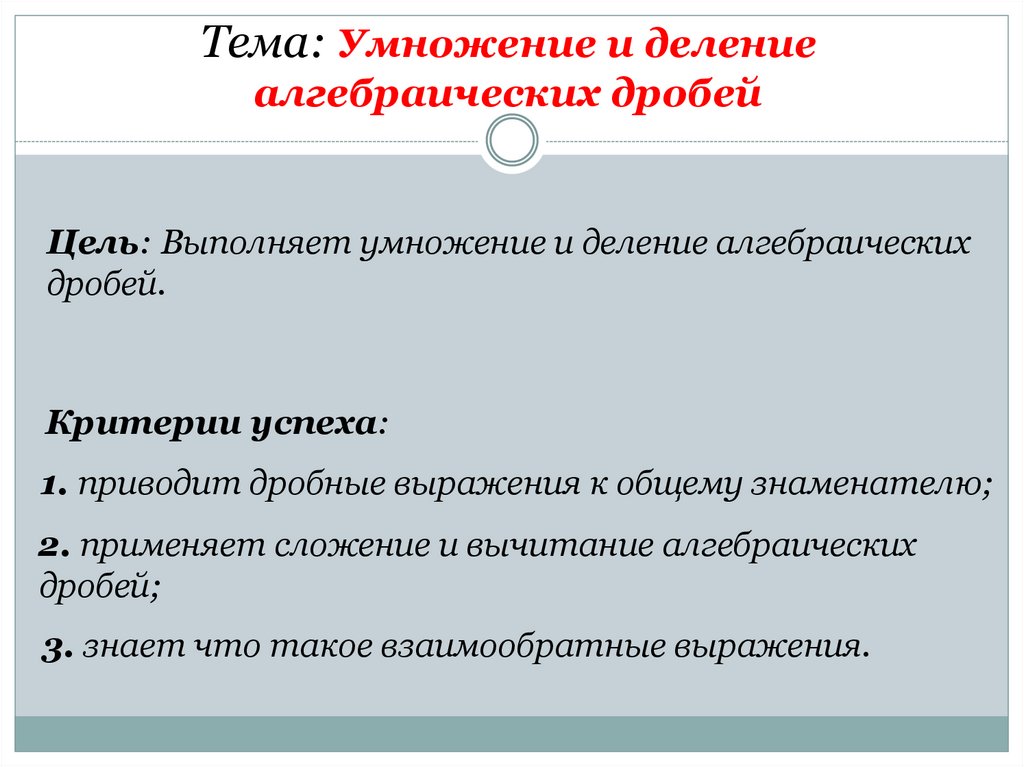 Цель: Выполняет умножение и деление алгебраическихдробей.