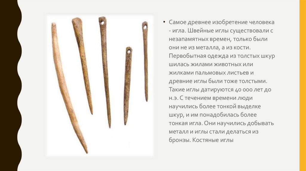 • Самое древнее изобретение человека- игла. Швейные иглы существовали с