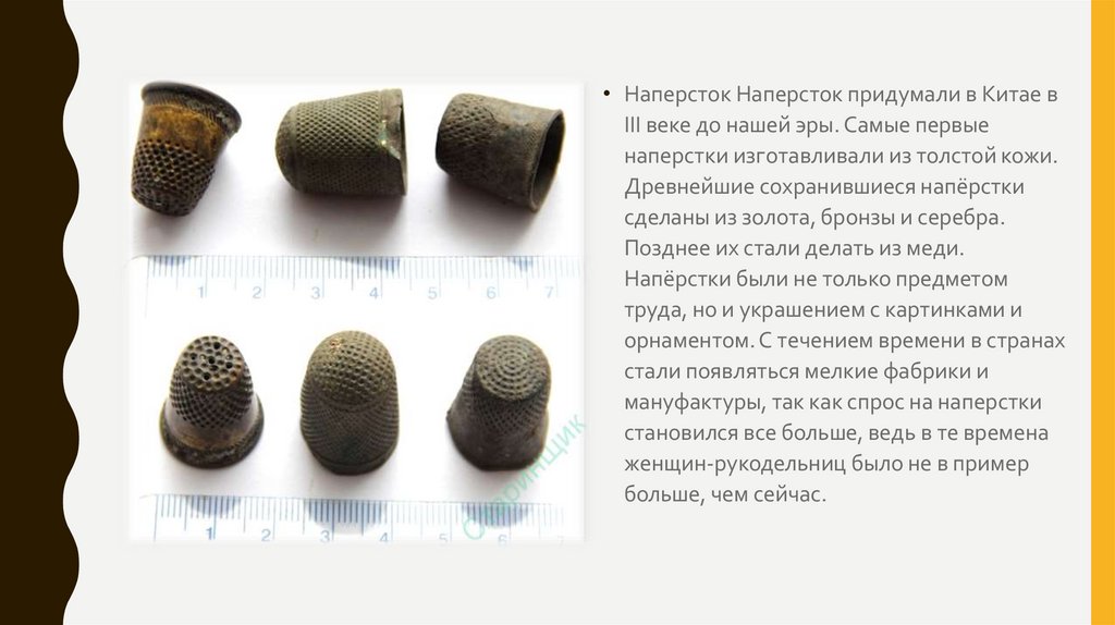 • Наперсток Наперсток придумали в Китае вIII веке до нашей эры. Самые первые