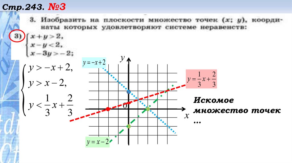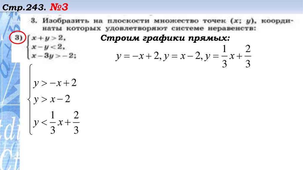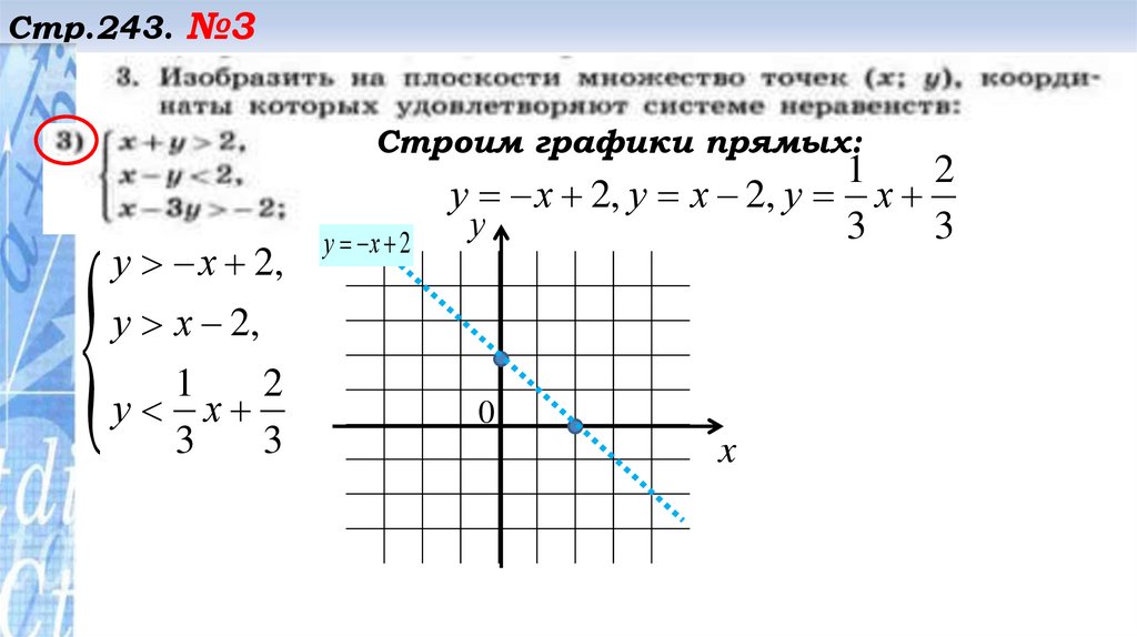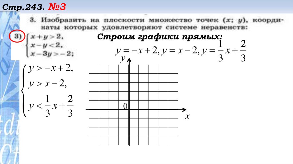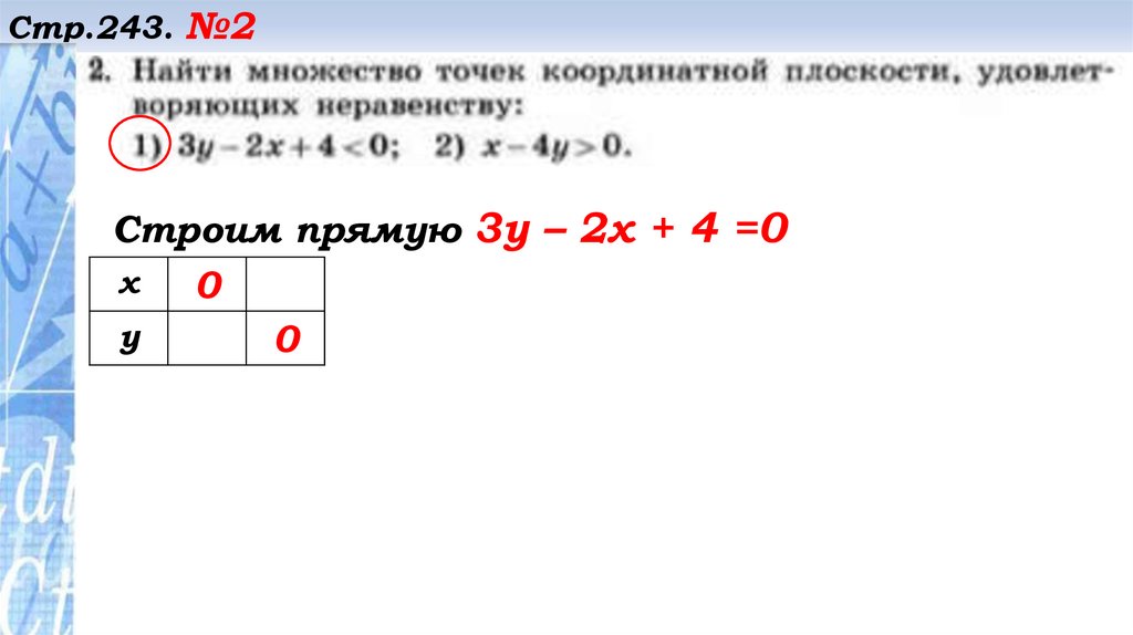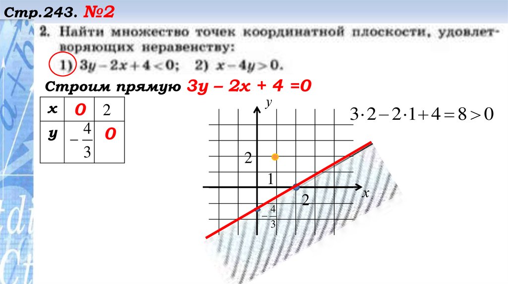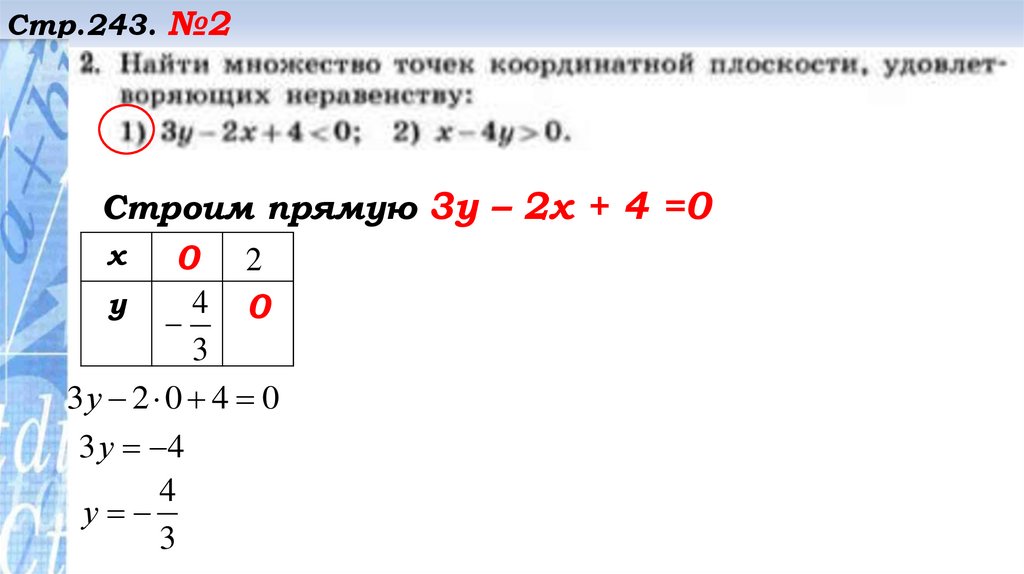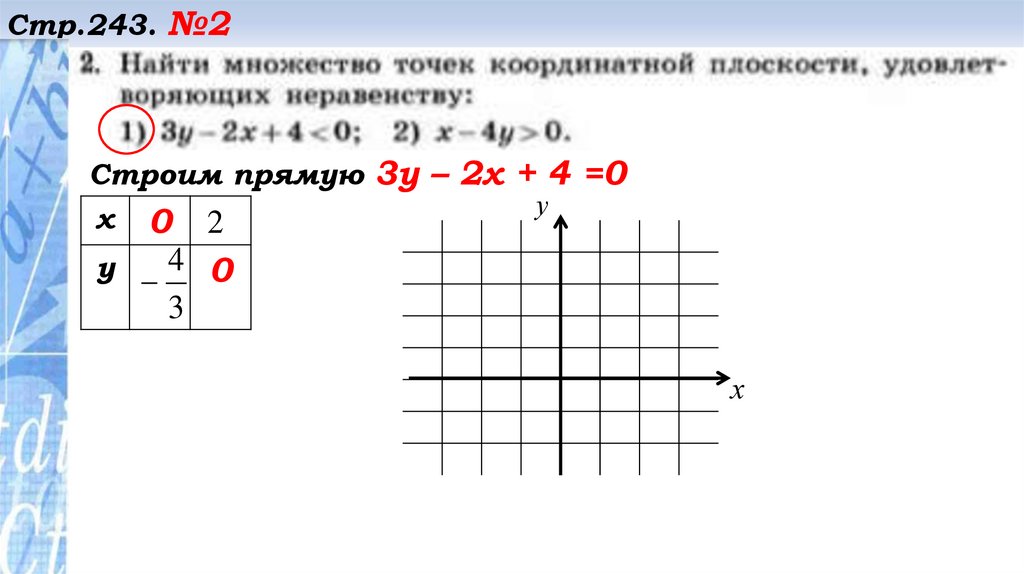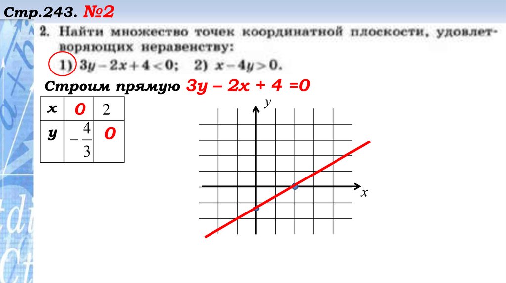 Стр.243. №2Строим прямую 3у – 2х + 4 =0